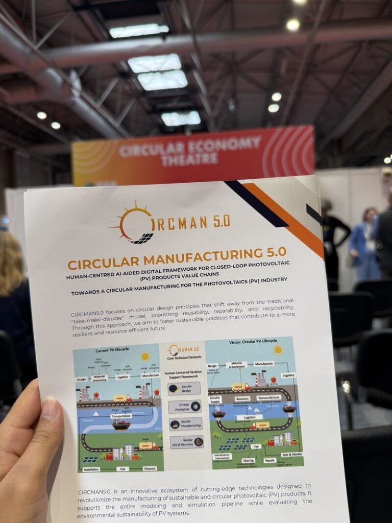 CIRCMAN5.0 is an initiative aimed at transforming the photovoltaic (PV) manufacturing sector into a more sustainable and efficient industry through the use of circular manufacturing principles. This project focuses on developing a human-centered, AI-aided digital framework designed to optimize the entire lifecycle of PV products—from design and production to end-of-life recovery. By integrating cutting-edge technologies such as machine learning, digital twins, and blockchain, CIRCMAN5.0 seeks to reduce environmental impact, enhance resource efficiency, and foster a sustainable future.